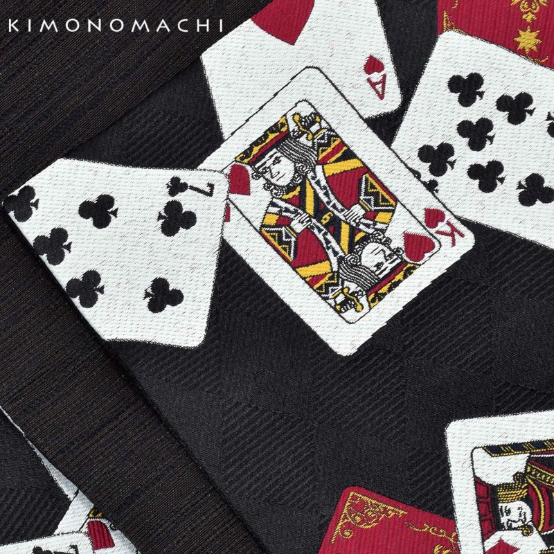 【色柄】黒地にトランプのカードを散らしたデザイン。白地に各種のスートの数札、絵札の表情まで細やかに表現されています。臙脂色に金茶のアラベスク模様の裏面がアクセント。