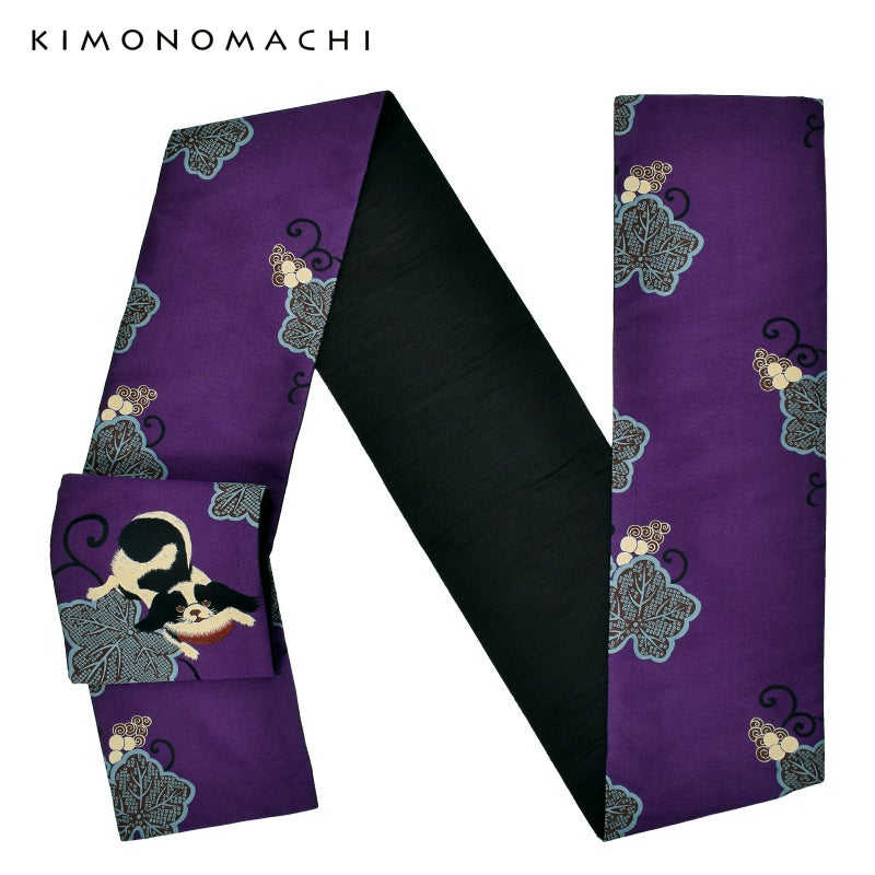 【色柄】深い紫色の地に、スモークブルー、茶色の葉と黒の葡萄蔦。お太鼓部分には、深い赤の前掛けをしたアイボリーと黒の狆。繊細な毛並みの表現や、無邪気な愛くるしい表情が他にはないデザインです。合わせやすい落ち着いた色合いと、愛嬌たっぷりの雰囲気が魅力の帯です。