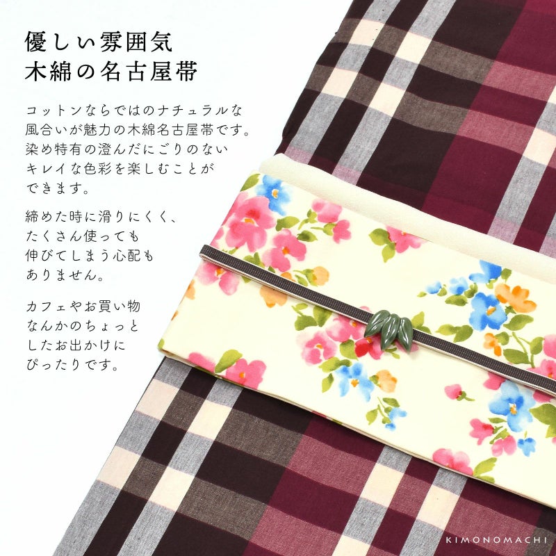 コットンならではのナチュラルな風合いが魅力の木綿名古屋帯です。染め特有の澄んだにごりのないキレイな色彩を楽しむことができます。