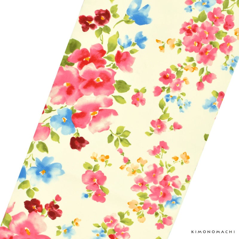 【色柄】柔らかな白色地に、ピンク、ブルーなどの色使いの水彩画のようなお花模様。