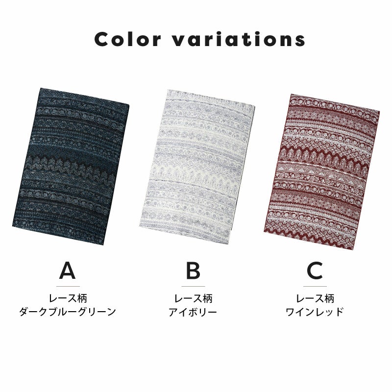 A.レース柄 ダークブルーグリーン:紺に近い濃い青緑の地に黒とシルバーグレーで花や幾何学のレース模様が横段に表現されています。