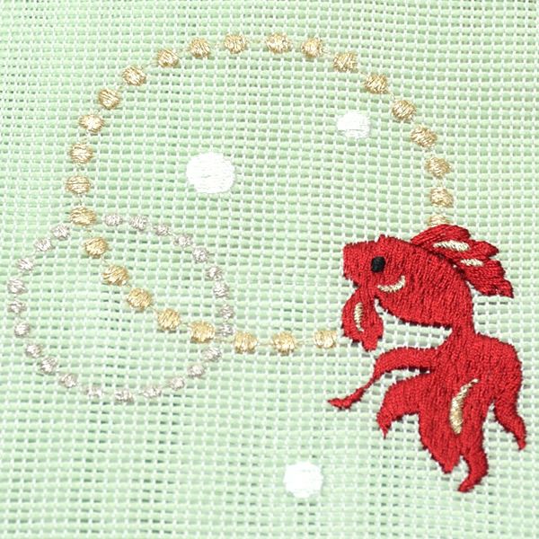 【Prices down2】夏半幅帯「グリーン 金魚」細帯 刺繍 お仕立て上がり 四寸帯 夏帯 【メール便不可】0ss2512oyk60