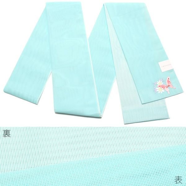 【Prices down2】夏半幅帯「水色 蝶」細帯 刺繍 お仕立て上がり 四寸帯 夏帯 【メール便不可】0ss2512oyk60