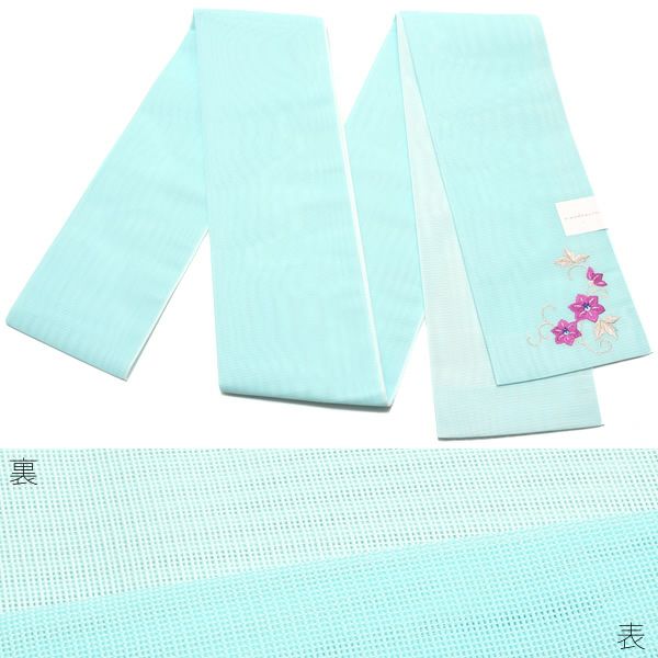 【Prices down2】夏半幅帯「水色 鉄線」細帯 刺繍 お仕立て上がり 四寸帯 夏帯 【メール便不可】0ss2512oyk60