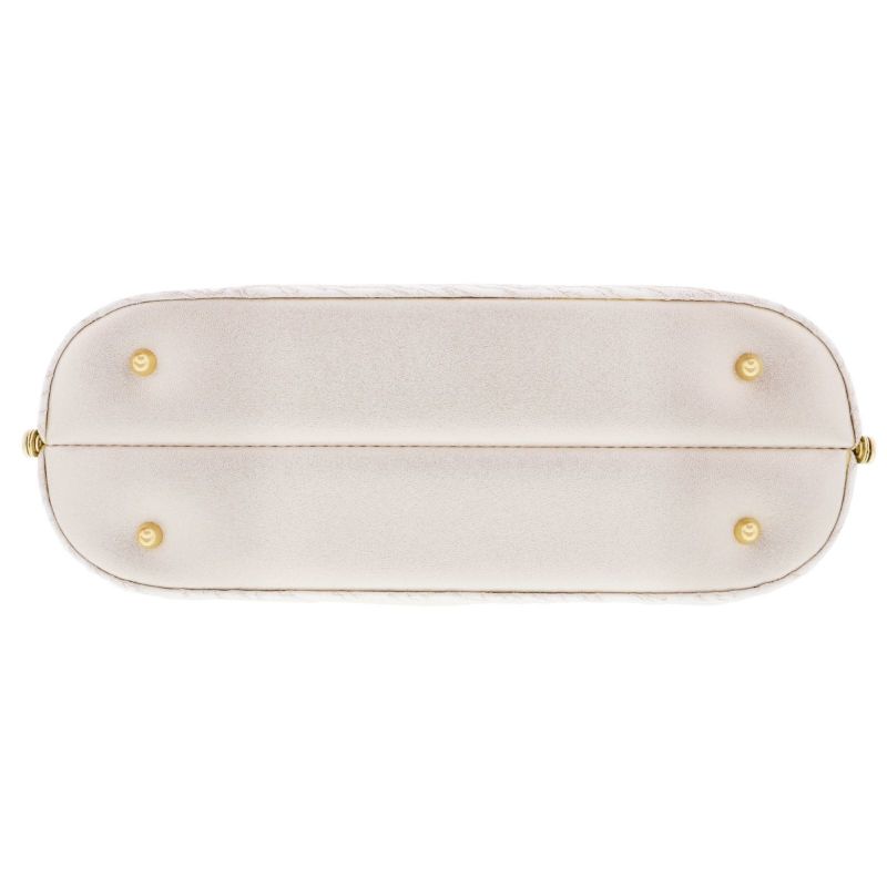バッグの表裏、草履の鼻緒、草履の芯の巻きは、ごく淡いグレイッシュな白地に銀のマーブル模様。淡く虹色の光沢があり、上品な高級感。バッグの口金はややマットな金の繊細な透かし模様。草履の台は、細かな金の輝きのあるシャンパンゴールド。