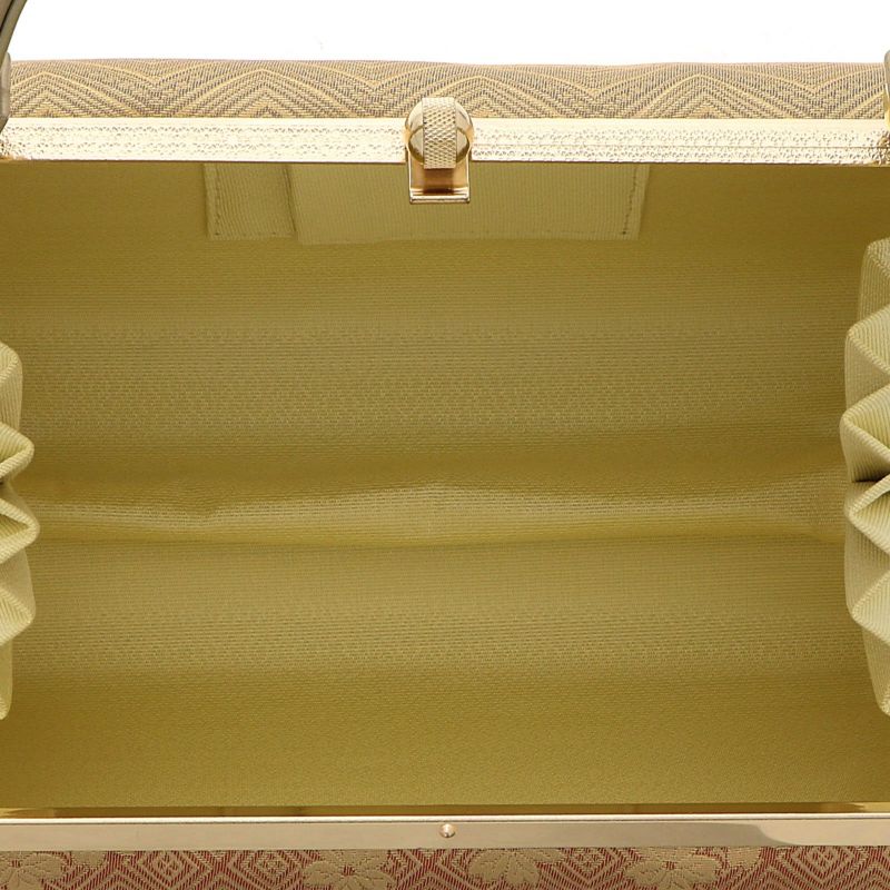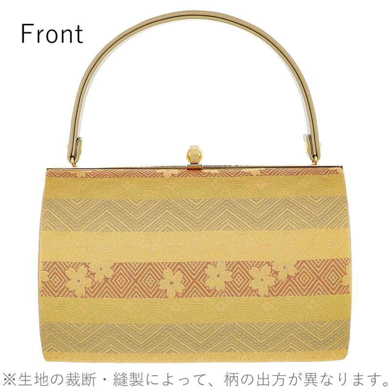【色柄】バッグの表と裏、持ち手は、ベージュ、朱、浅い青、抹茶色などの横段の中に落ち着いたゴールドなどで亀甲や花、山道文様が織り出されています。口金はゴールド。草履の鼻緒はバッグと共生地。前坪、草履の台は、細かな梨地のようなラメ感のあるゴールド。