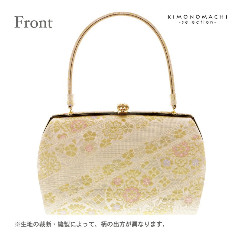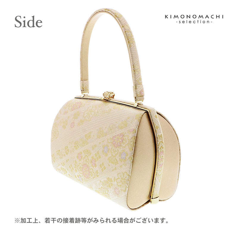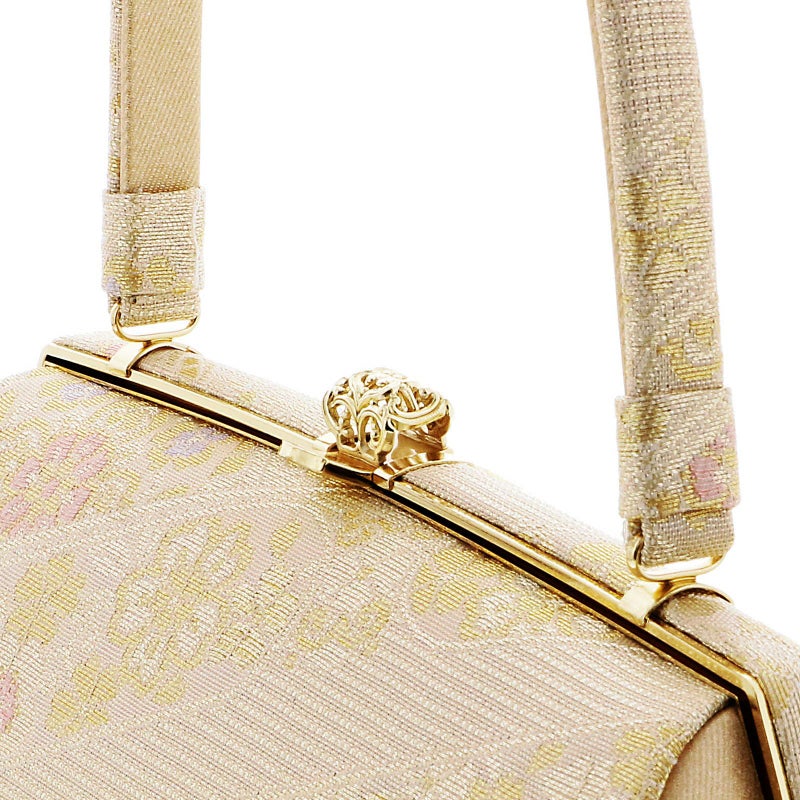 【色柄】バッグの表と裏、持ち手は、ホワイトゴールドを基調に淡いピンクと藤色の入った花紋が斜めに配置されています。口金はゴールド。草履の鼻緒はバッグと共生地。前坪、草履の台はゴールド。
