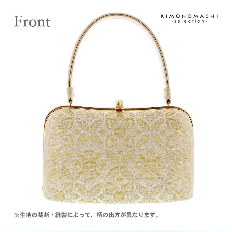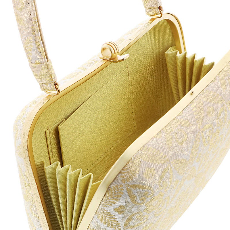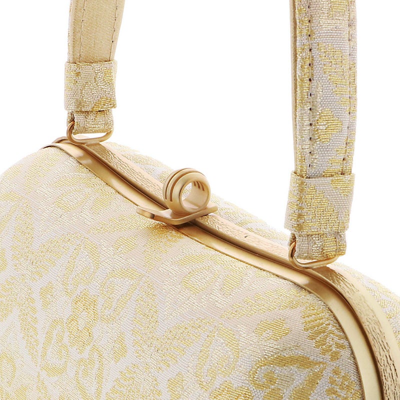 【色柄】バッグの表と裏、持ち手は、シルバーとゴールドで織り出された羊歯菱と唐花文様。口金はゴールド。草履の鼻緒はバッグと共生地。前坪、草履の台はゴールド。