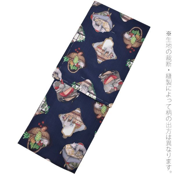 和風館×Frutta rossa浴衣4点セット「紺色 猫のサーシャ」ポリエステル浴衣 三分紐、帯留めの帯飾り付き 吸水速乾 お仕立て上がり浴衣セット 変わり織り 【メール便不可】