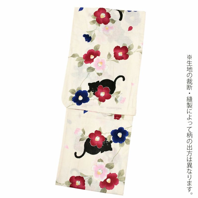 【色柄】淡いクリーム色の地に臙脂色や淡いピンク、瑠璃紺色の椿の花。淡い抹茶色の葉にはポイントに金色のラインが引かれています。黒猫がとってもキュート!