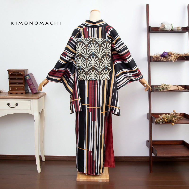 KIMONOMACHI オリジナル! 個性派洗える二尺袖着物 レトロモダン 古典柄 アンティーク着物風 (卒業式応援SALE3/31迄)二尺袖着物 単品 「ラインカラー 黄色×薄香」 KIMONOMACHIオリジナル お仕立て上がり レディース 洗える着物 二尺袖 着物 袴に合わせて 卒業式 謝恩会に 通常丈 長着 カジュアル着物 【メール便不可】ss2506kck20