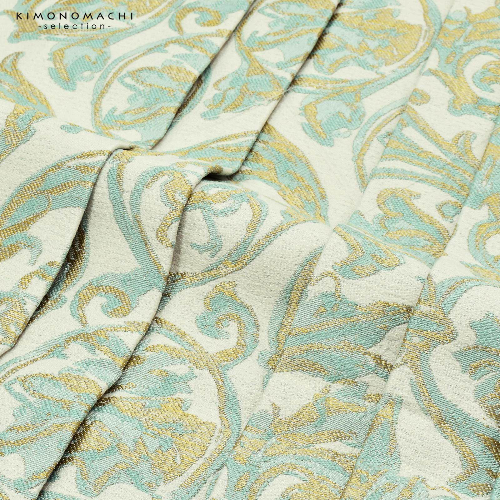 【色柄】グレイッシュなオフホワイトの地に、アクアブルー、ゴールドの織りで表現されたパルメット風の唐草文様。