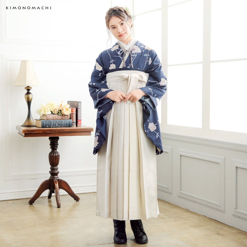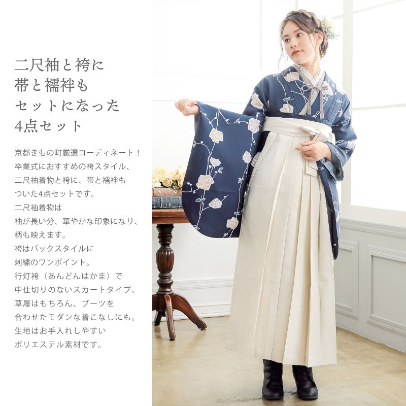 袴 セット 卒業式 女性 4点セット「二尺袖:ばら墨紺色+袴:オフホワイト 葡萄+袴下帯:黒 麻の葉+襦袢」卒業式 女性 レディース お仕立て上がり 袴セット 二尺袖着物セット 着物 二尺着物 袴