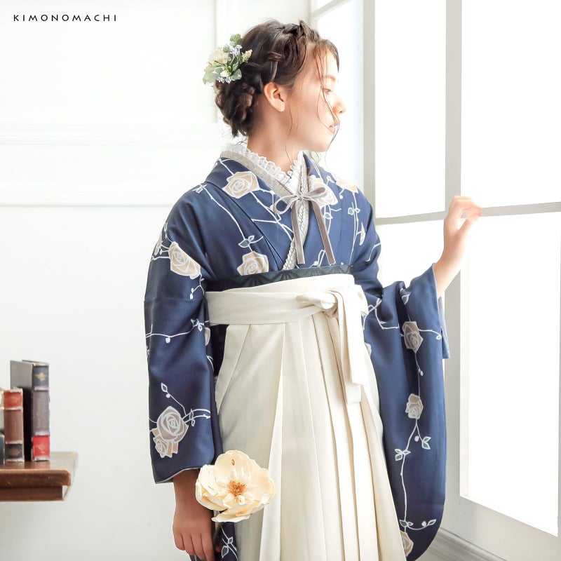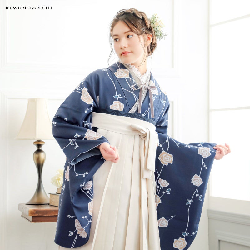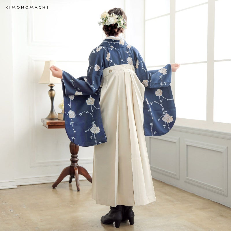 袴 セット 卒業式 女性 4点セット「二尺袖:ばら墨紺色+袴:オフホワイト 葡萄+袴下帯:黒 麻の葉+襦袢」卒業式 女性 レディース お仕立て上がり 袴セット 二尺袖着物セット 着物 二尺着物 袴【メール便不可】