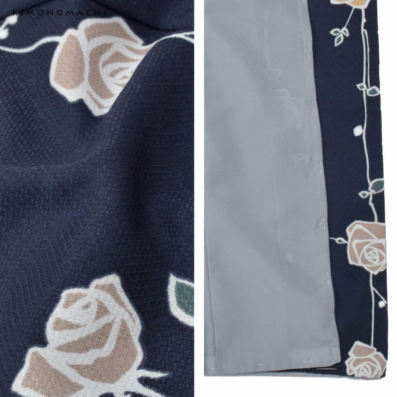 二尺袖着物:細かな地模様のある生地。灰みの紺地に、ごく淡いグレーの輪郭線、ベージュやグレージュの花、深い青緑の葉のバラの花。やや直線的なデザインが現代的な中に懐かしさを感じさせます。裏地はグレー。