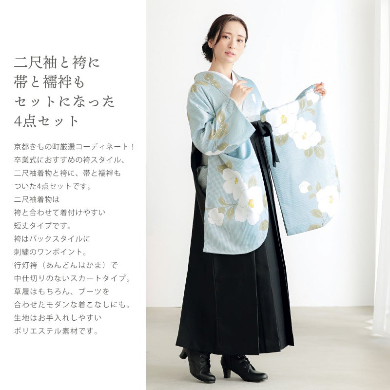 京都きもの町厳選コーディネート!卒業式におすすめの袴スタイル、二尺袖着物と袴に、帯と補袢もついた4点セットです。
