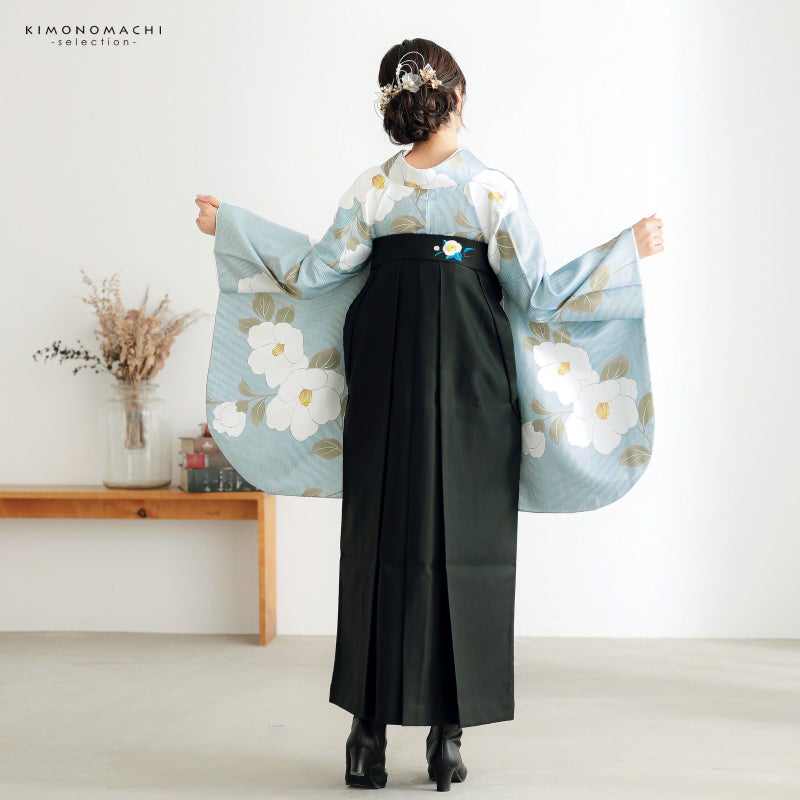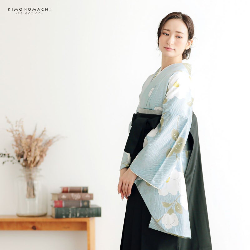 袴 セット 卒業式 女性 4点セット「二尺袖:縞に椿 スモークブルー+袴:黒 椿の刺繍+袴下帯:ウォームグレー 麻の葉+襦袢」卒業式 女性 レディース お仕立て上がり 袴セット 二尺袖着物セット 着物 二尺着物 袴