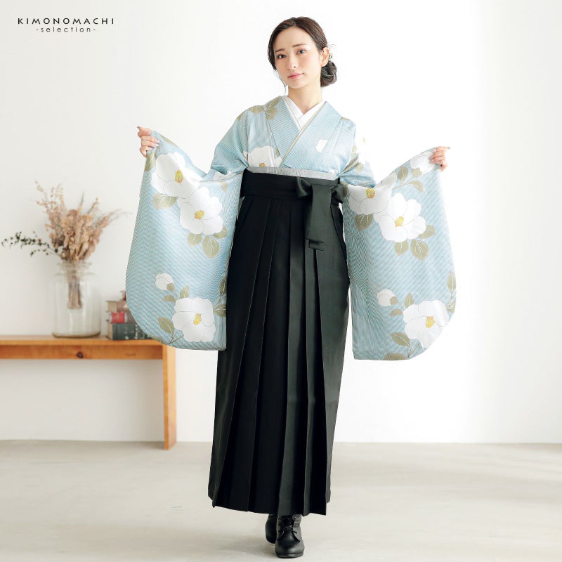 袴 セット 卒業式 女性 4点セット「二尺袖:縞に椿 スモークブルー+袴:黒 椿の刺繍+袴下帯:ウォームグレー 麻の葉+襦袢」卒業式 女性 レディース お仕立て上がり 袴セット 二尺袖着物セット 着物 二尺着物 袴【メール便不可】