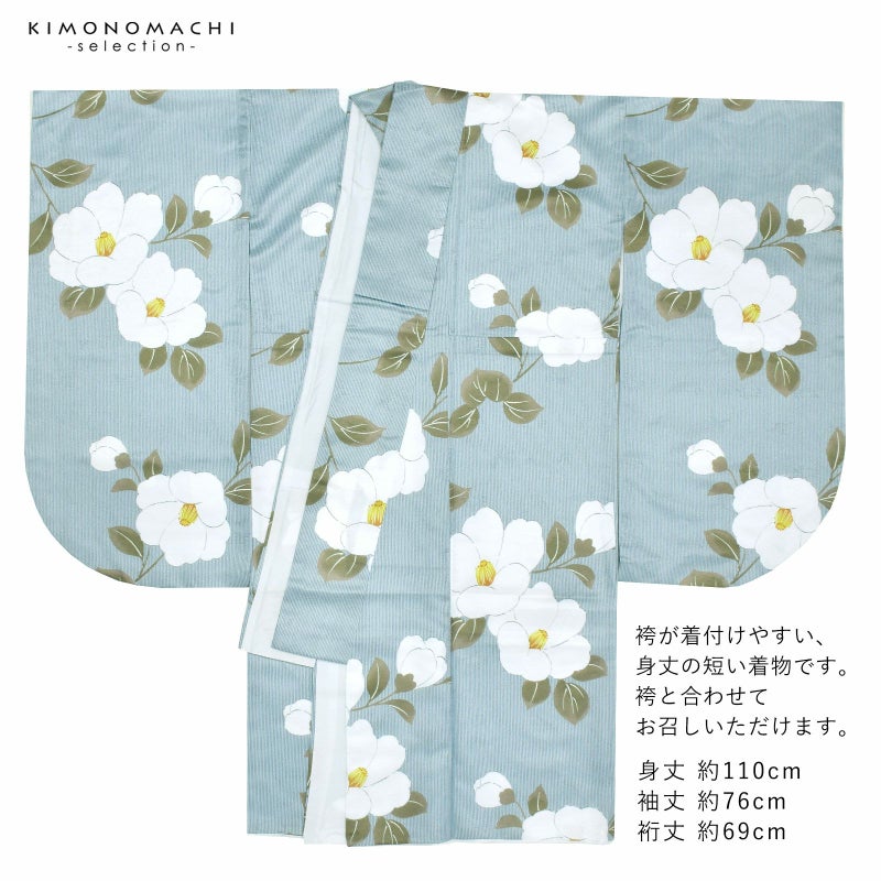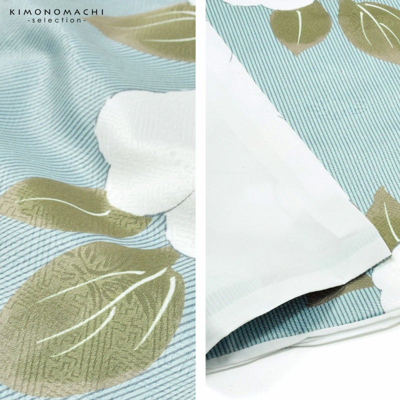 二尺袖着物:紗綾形に花の地模様の生地。グレイッシュな水色にスモークブルーの細かな縞の地、白の花びらにからし色の蕊の椿の花。抹茶色の濃淡で表現された枝葉。