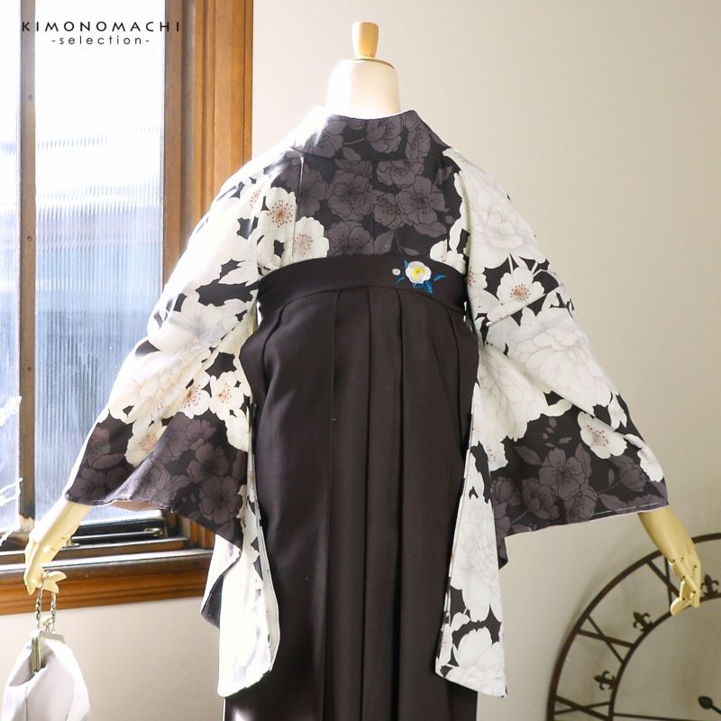 卒業式に 二尺袖袴セット 卒業式 袴 レディース (卒業式応援Point10倍 2/5迄)袴 セット 卒業式 女性 4点セット「二尺袖:牡丹に桜 こげ茶×ココア+刺繍袴:アンティークブラウン+袴下帯:白+襦袢」卒業式 女性 レディース お仕立て上がり 袴セット 二尺袖着物セット 着物 二尺着物 袴【メール便不可】
