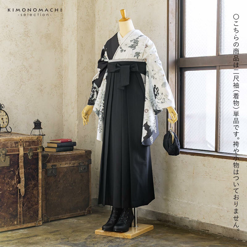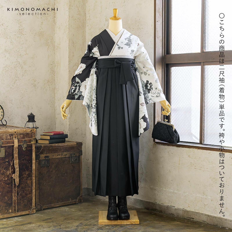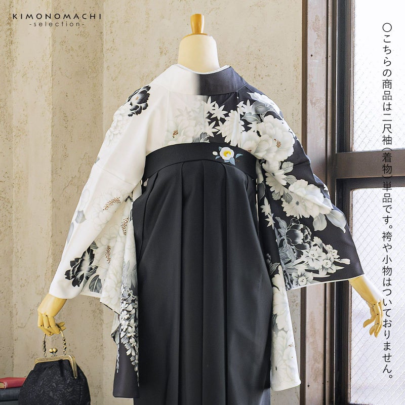 卒業式、謝恩会に 袴に合わせて華やかに 二尺袖着物 二尺袖着物 単品「白×黒 牡丹に四季花」Fサイズ お仕立て上がり 短丈 ショート丈 レディース 洗える着物 二尺袖 着物 袴に合わせて 卒業式 謝恩会【メール便不可】