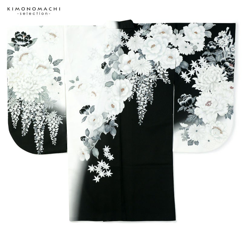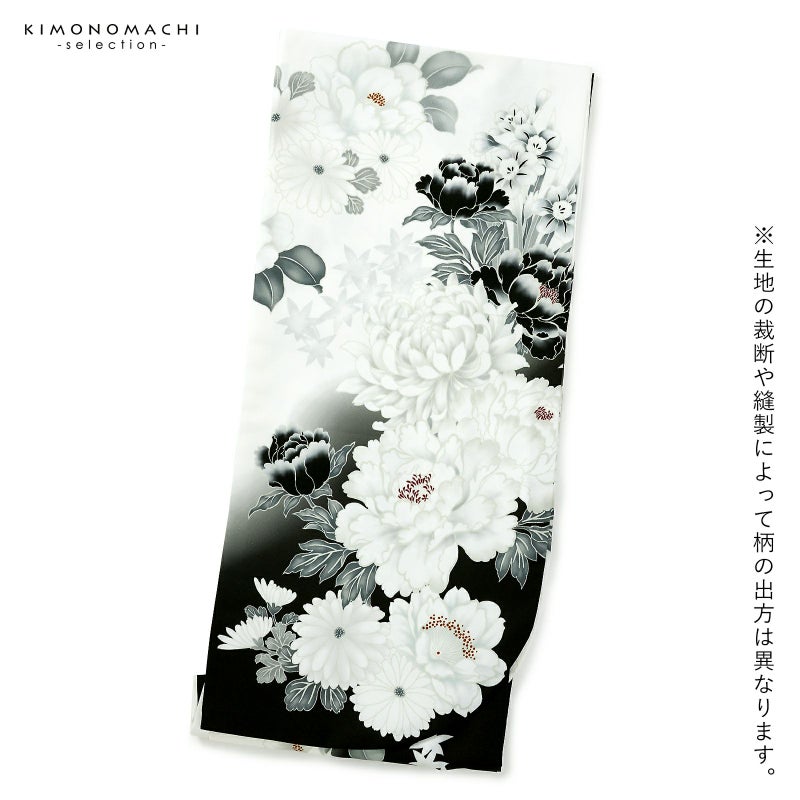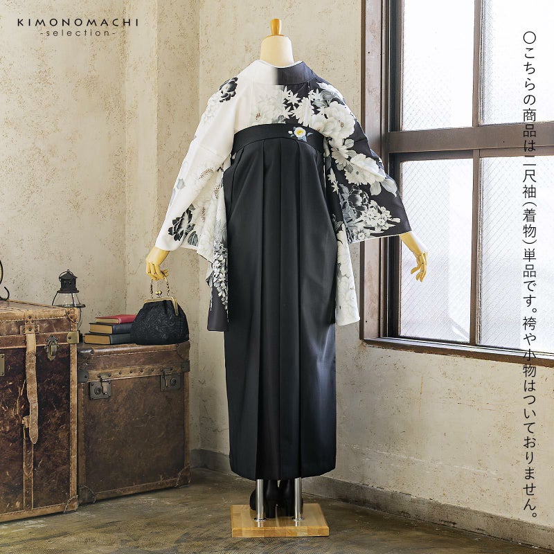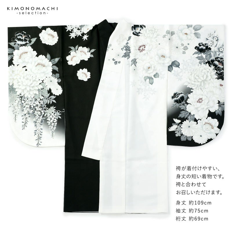 5. 二尺袖着物 単品「白×黒 牡丹に四季花」Fサイズ お仕立て上がり 短丈 ショート丈 レディース 洗える着物 二尺袖 着物 袴に合わせて 卒業式 謝恩会【メール便不可】