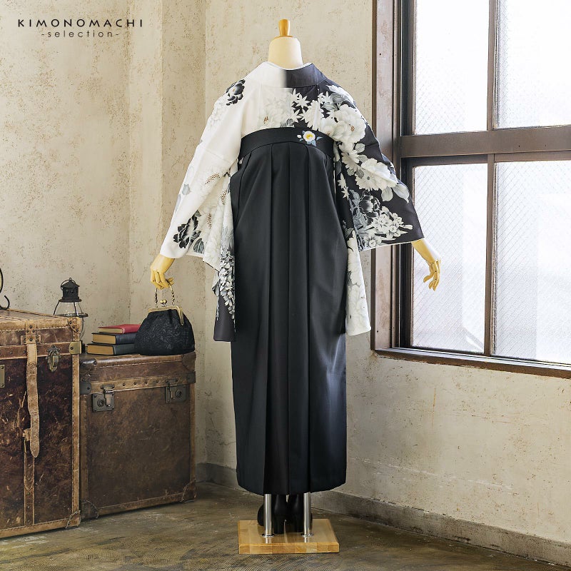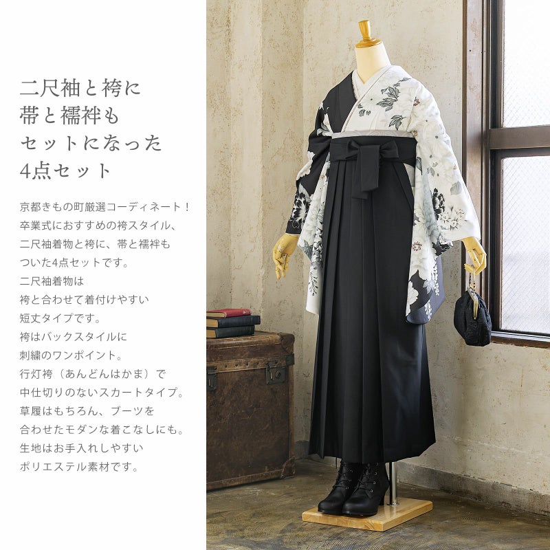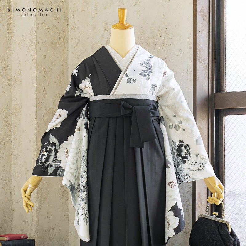 袴 セット 卒業式 女性 4点セット「二尺袖:白×黒 牡丹に四季花+袴:黒 椿+袴下帯: シルバーグレー 七宝+襦袢」S/M/L/LL サイズ 卒業式 女性 レディース お仕立て上がり 袴セット 二尺袖着物セット 着物 二尺着物 袴【メール便不可】