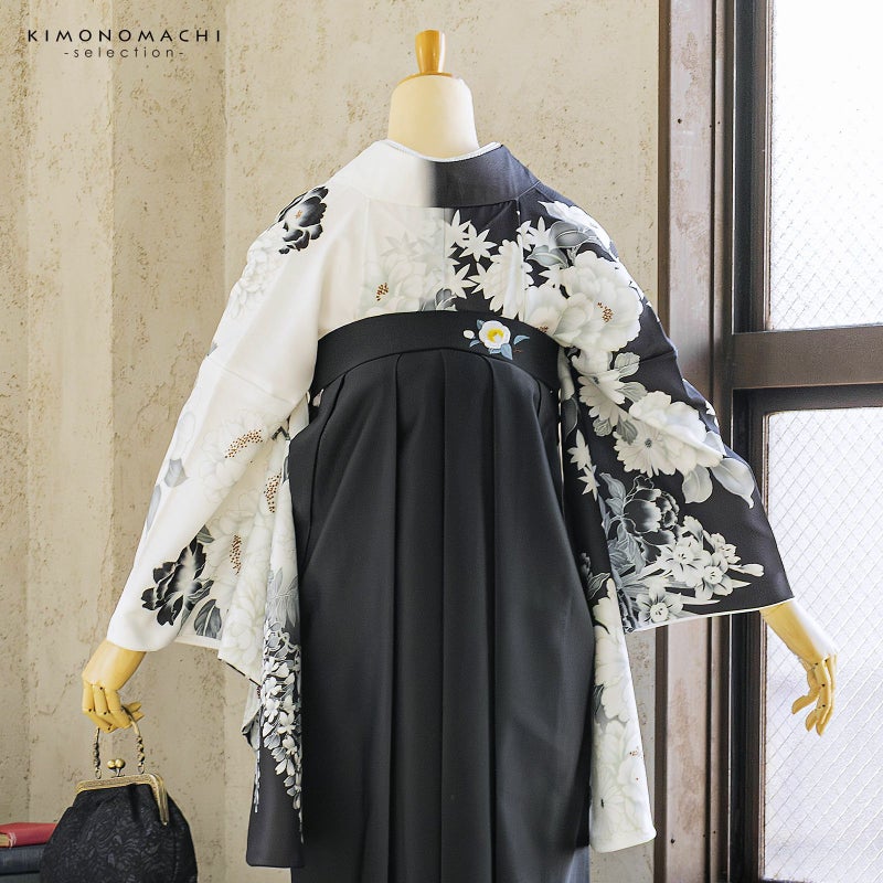 卒業式に 二尺袖袴セット 卒業式 袴 レディース 袴 セット 卒業式 女性 4点セット「二尺袖:白×黒 牡丹に四季花+袴:黒 椿+袴下帯: シルバーグレー 七宝+襦袢」SS/S/M/L/LL サイズ 卒業式 女性 レディース お仕立て上がり 袴セット 二尺袖着物セット 着物 二尺着物 袴【メール便不可】
