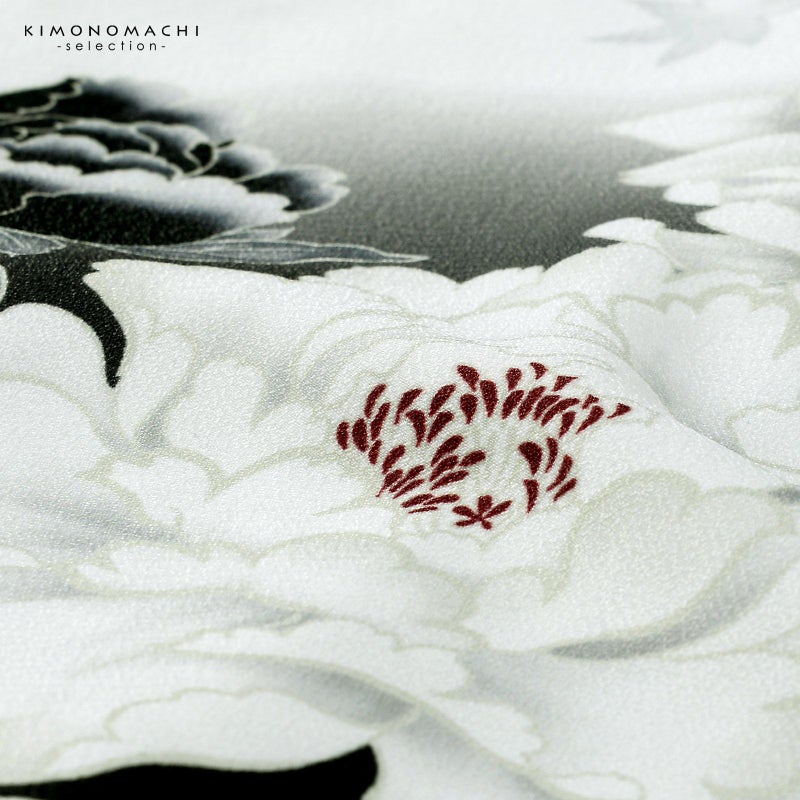 二尺袖着物:上前は白地に黒のぼかし、下前は黒地に白ぼかしの片身替わり風。黒やごく淡い灰黄緑、アイボリーで表現された牡丹に菊、藤、楓、水仙、薔薇などの四季の花。赤紫や赤茶の蕊がアクセント。柄が縫い目をまたいで繋がる絵羽になっています。
