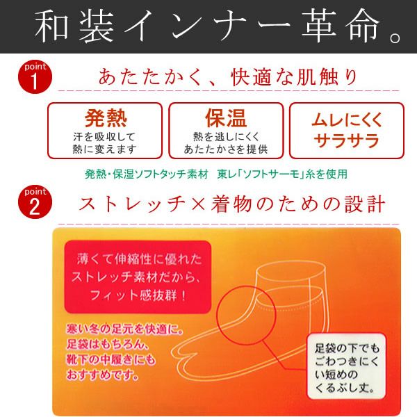 他の画像を見る 東レ ソフトサーモ糸使用 温か足袋インナー 和装インナー ヒート+ふぃっと ストレッチ足袋インナー(Mサイズ/Lサイズ)【メール便対応不可】 東レ ソフトサーモ糸使用 温か足袋インナー<R> きもの町価格 ¥ 715 税込 カートに入れる お気に入りに登録する