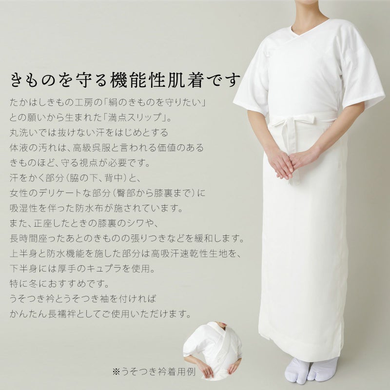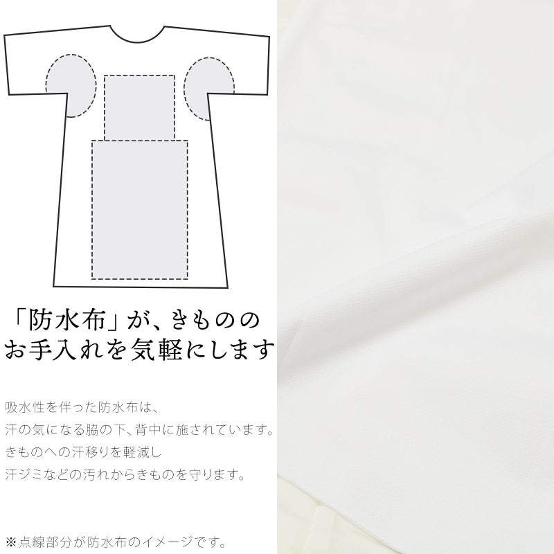 汗をかく部分(脇の下、背中)と、女性のデリケートな部分(臀部から膝裏まで)に吸湿性を伴った防水布を施しました。それにより、汗ジミや生理、尿漏れなどの汚れからきものを守ります。また、正座したときの膝裏のシワや、長時間座ったあとのきものの張りつきなどを緩和します。上半身と防水機能を施した部分は高吸汗速乾性生地を、下半身には厚手のキュプラを使用。特に冬におすすめです。うそつき衿とうそつき袖を付ければかんたん長襦袢としてご使用いただけます。