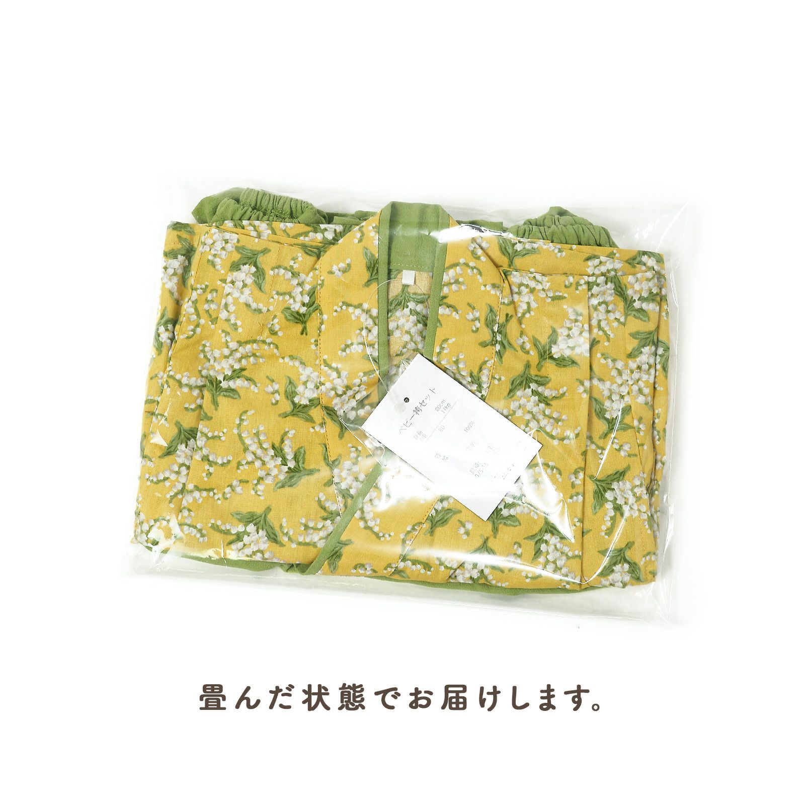 【色柄】着物はややグレイッシュな落ち着いた黄色の地に白と緑のスズラン模様。浅い黄緑の重ね衿。袴は浅い黄緑。