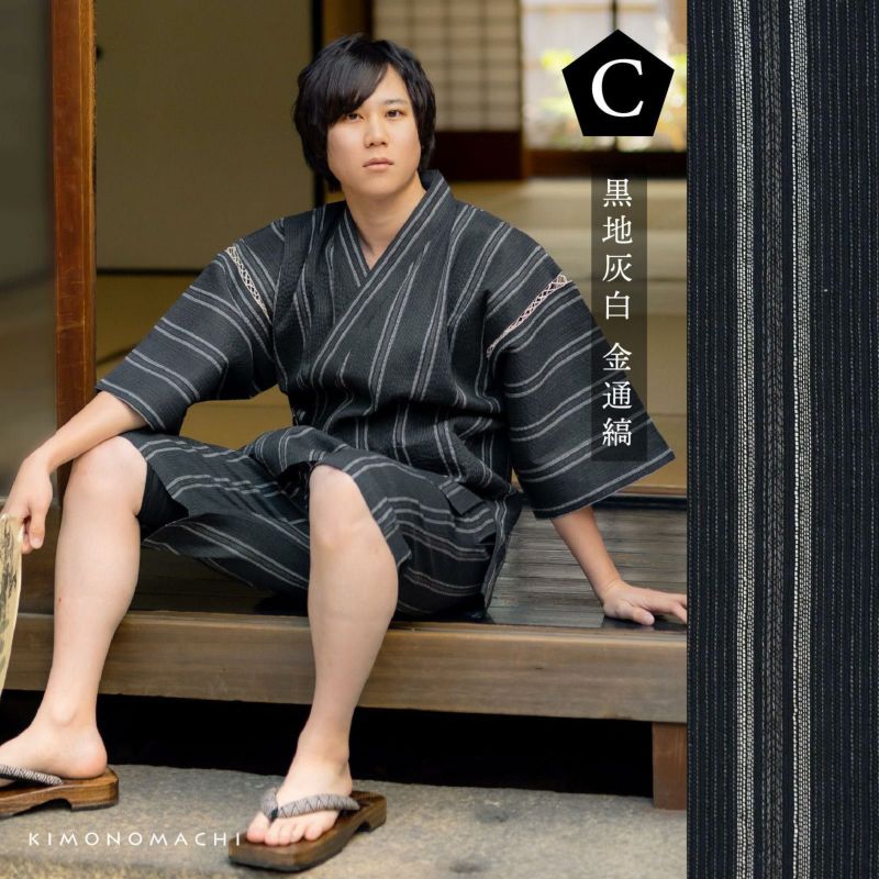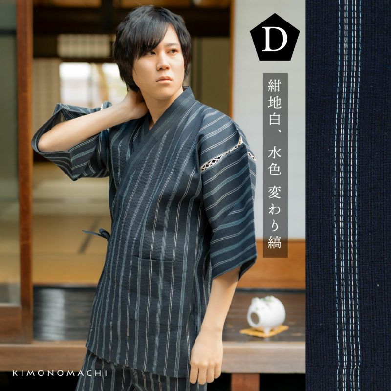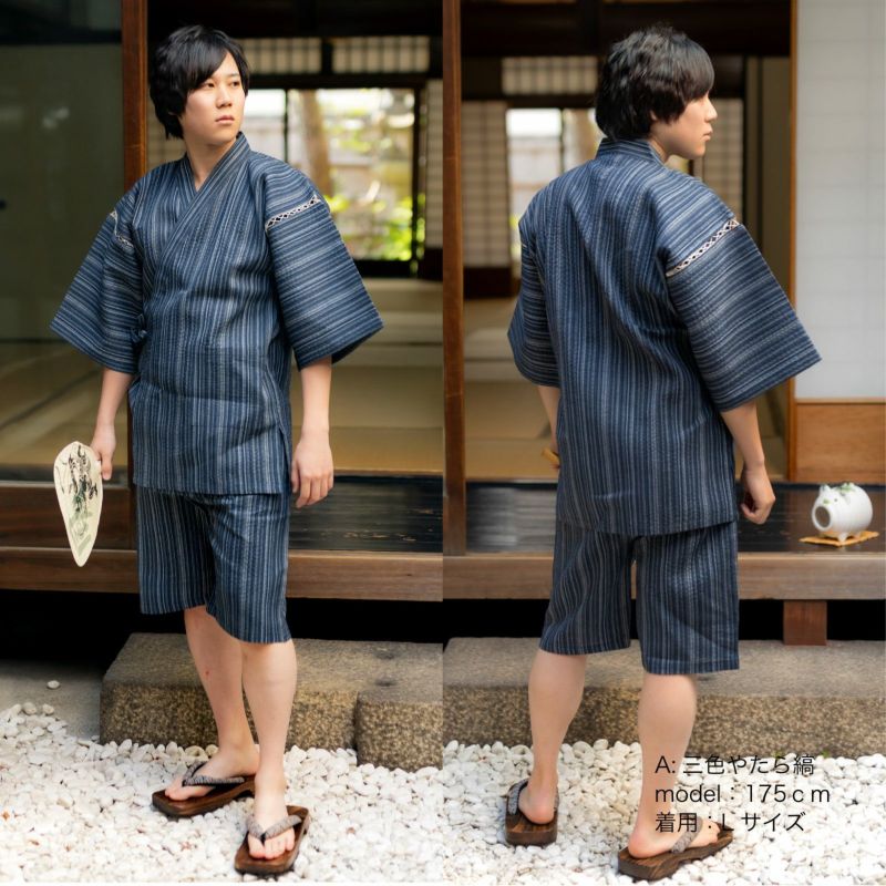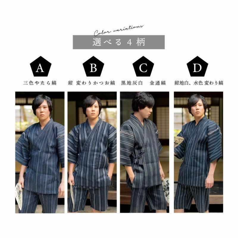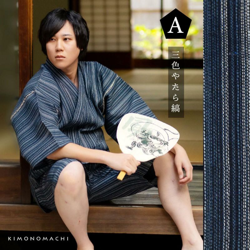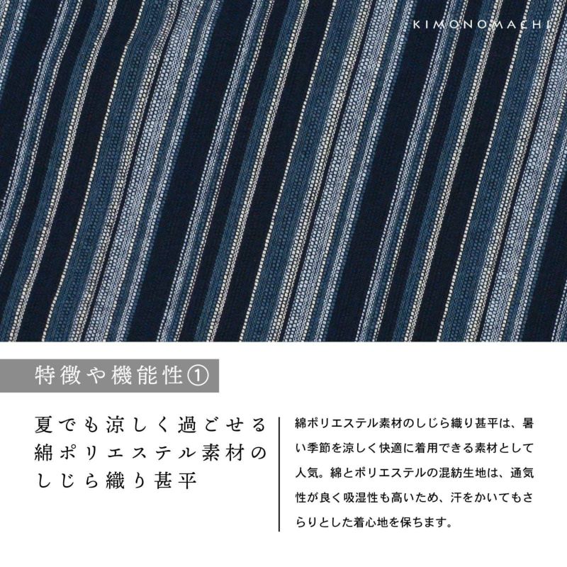 綿ポリエステル素材のしじら織り甚平は、暑い季節を涼しく快適に着用できる素材として人気。
