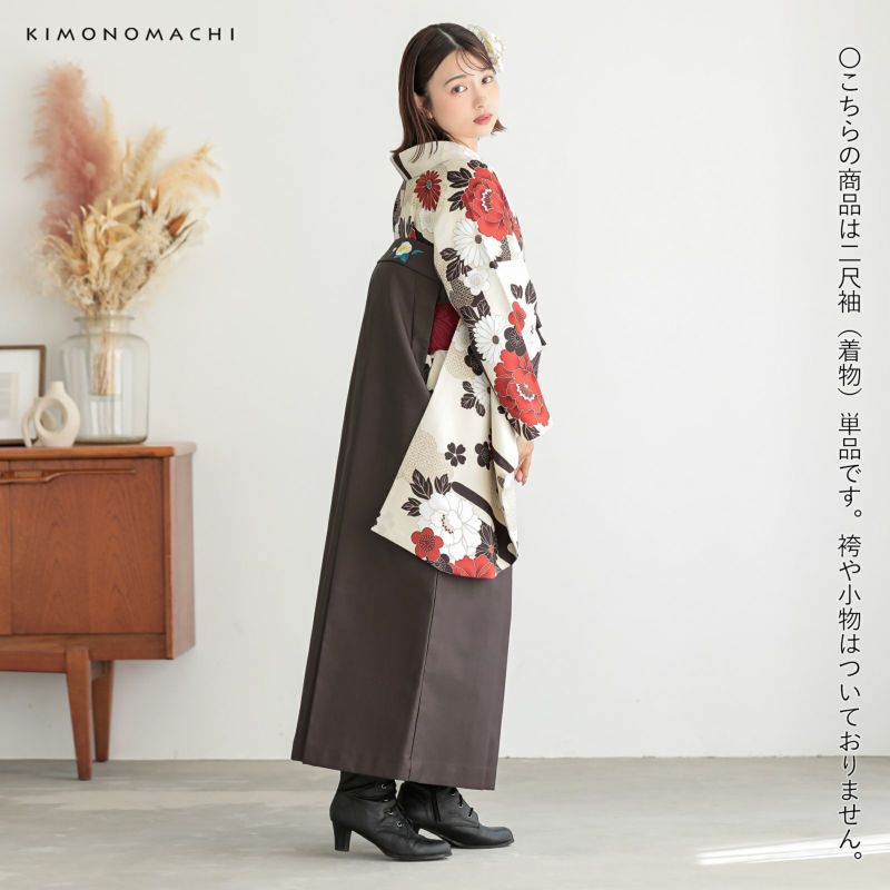 二尺袖着物 単品「雲に牡丹、花紋 生成り色」KIMONOMACHIオリジナル お仕立て上がり レディース 洗える着物 二尺袖 着物 袴に合わせて 卒業式 謝恩会に 短丈【メール便不可】
