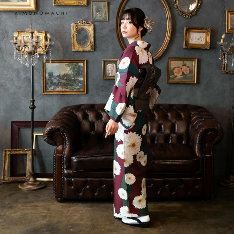 袷着物:細かな地模様のある生地。落ち着いた赤紫色の地に深い青緑の矢羽根、白に淡いベージュのぼかしの大小の菊の花。深い色合いとアンティーク調の大胆な柄行が魅力です。裏地は浅いターコイズ。