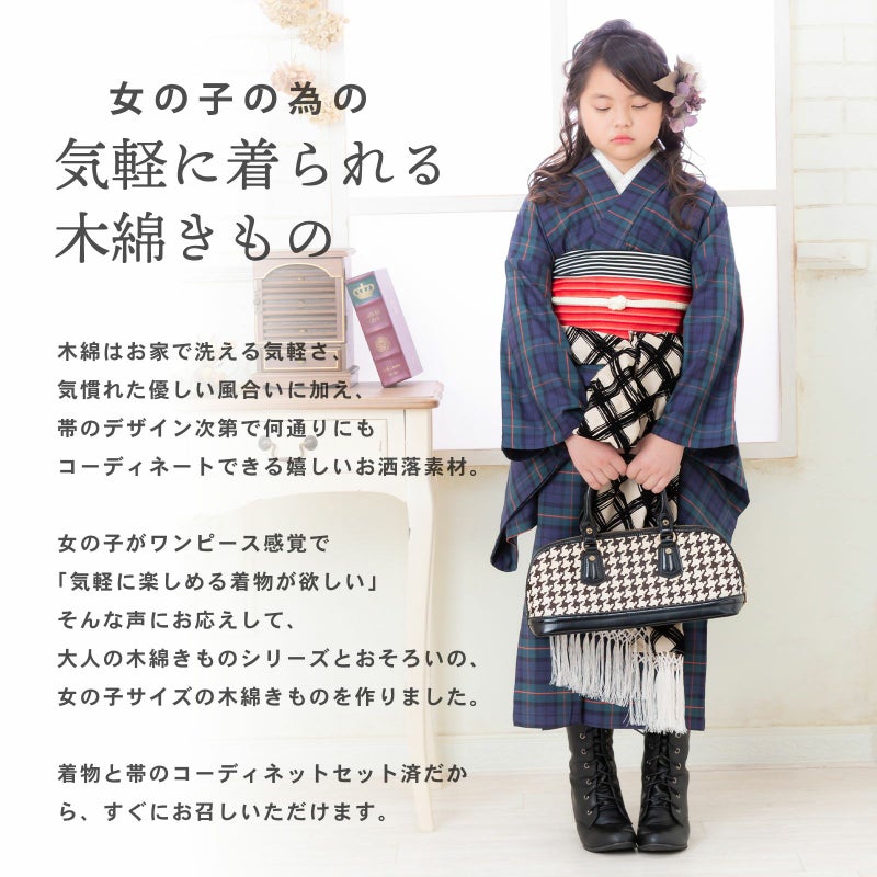 女の子がワンピース感覚で、「気軽に楽しめる着物が欲しい」そんな声にお応えして、大人の木綿着物シリーズとおそろいの、女の子サイズの木綿きものを作りました。