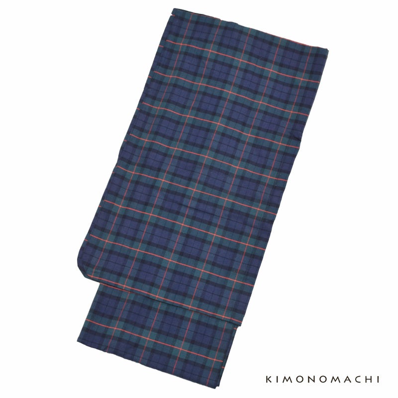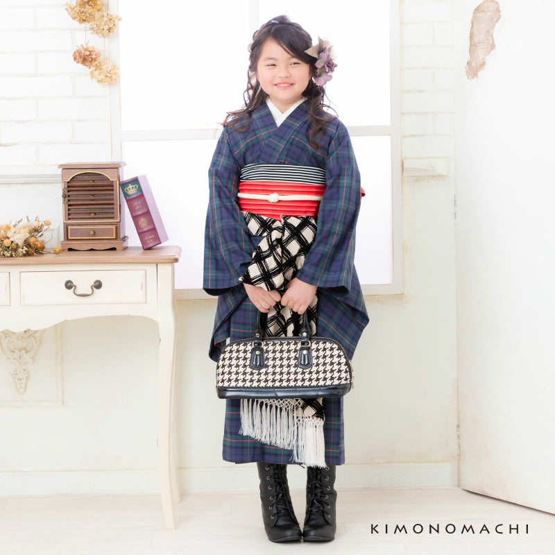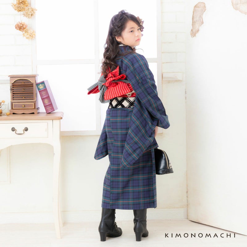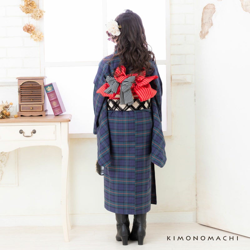 着物:グリーン、暗い浅めのネイビーに、朱赤色のチェック模様