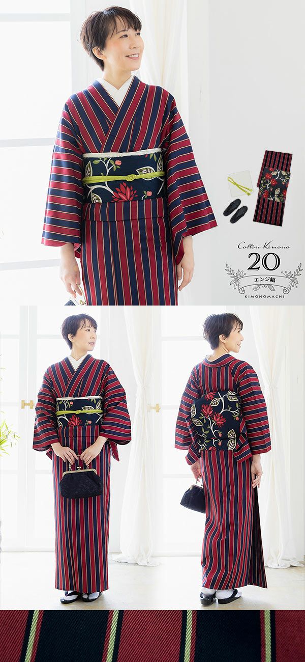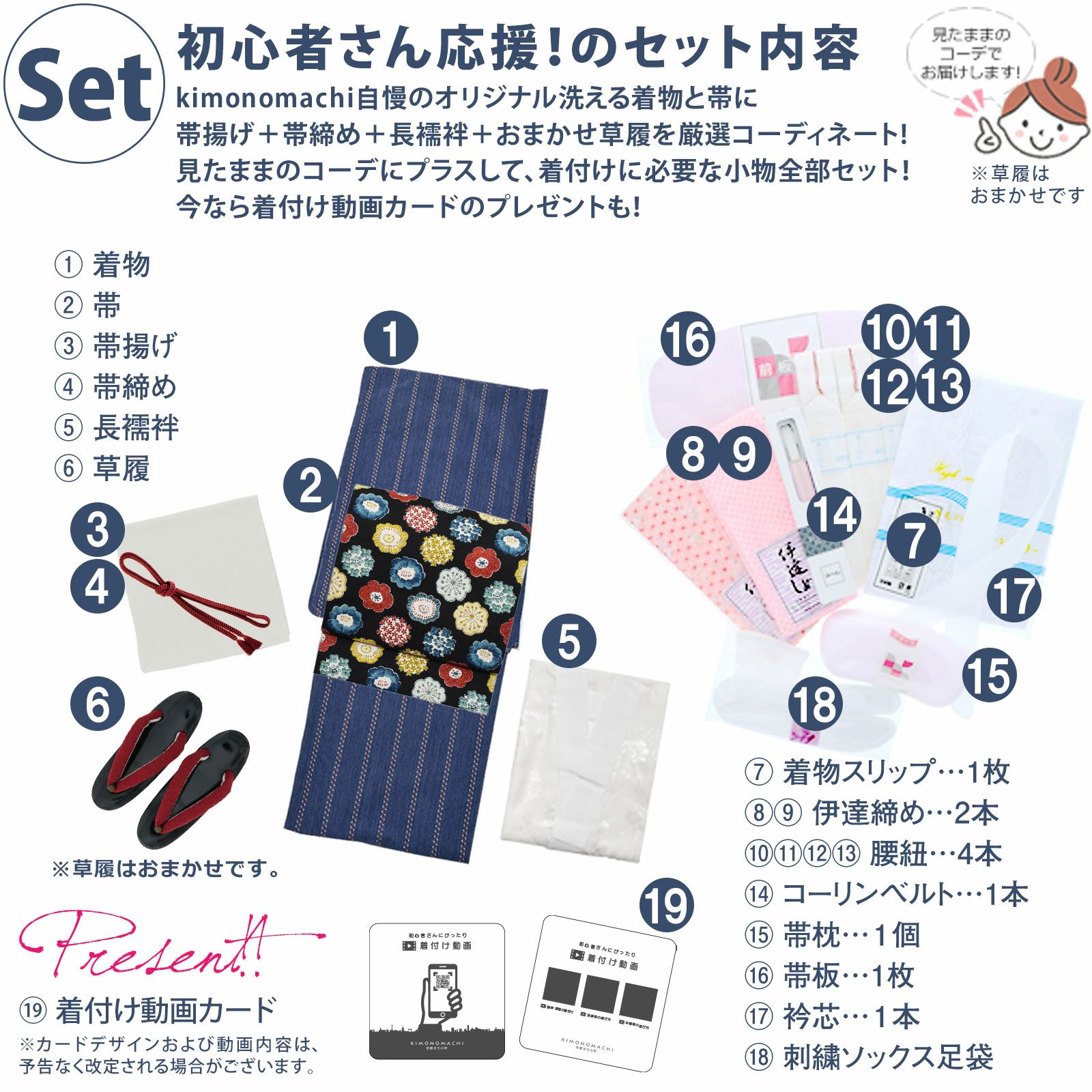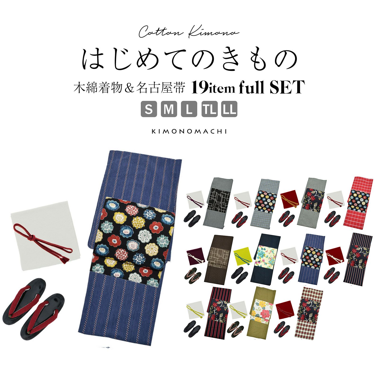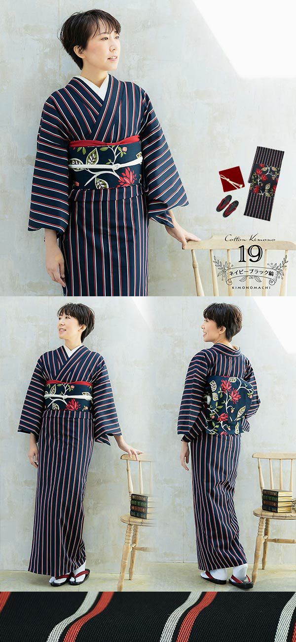 【商品内容】木綿着物+木綿名古屋帯+帯揚げ+帯締め+草履+襦袢+伊達締め2本+腰紐4本+衿芯+コーリンベルト+帯枕+帯板+スリップ+ソックス足袋+着付け動画カードの19点セット