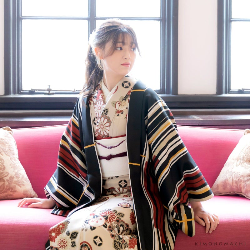 長めの丈なので、シルエットがすっきりと見えます。小紋や紬などのカジュアルな普段のお着物に合わせて、お洒落を楽しんでいただけます。少し肌寒い春先、秋、冬口などのサッと羽織って防寒対策に良いですね。羽織は洋服でいうところのカーディガンやジャケットのようなもので、コートと違い、室内でも着用していただけます。