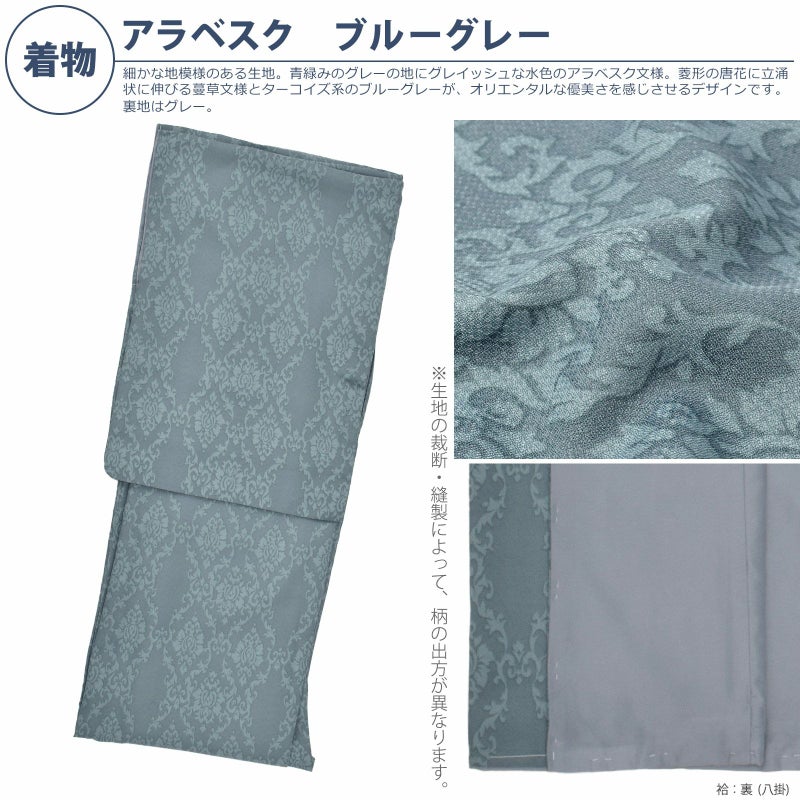 細かな地模様のある生地。青緑みのグレーの地にグレイッシュな水色のアラベスク文様。菱形の唐花に立涌状に伸びる蔓草文様とターコイズ系のブルーグレーが、オリエンタルな優美さを感じさせるデザインです。裏地はグレー。