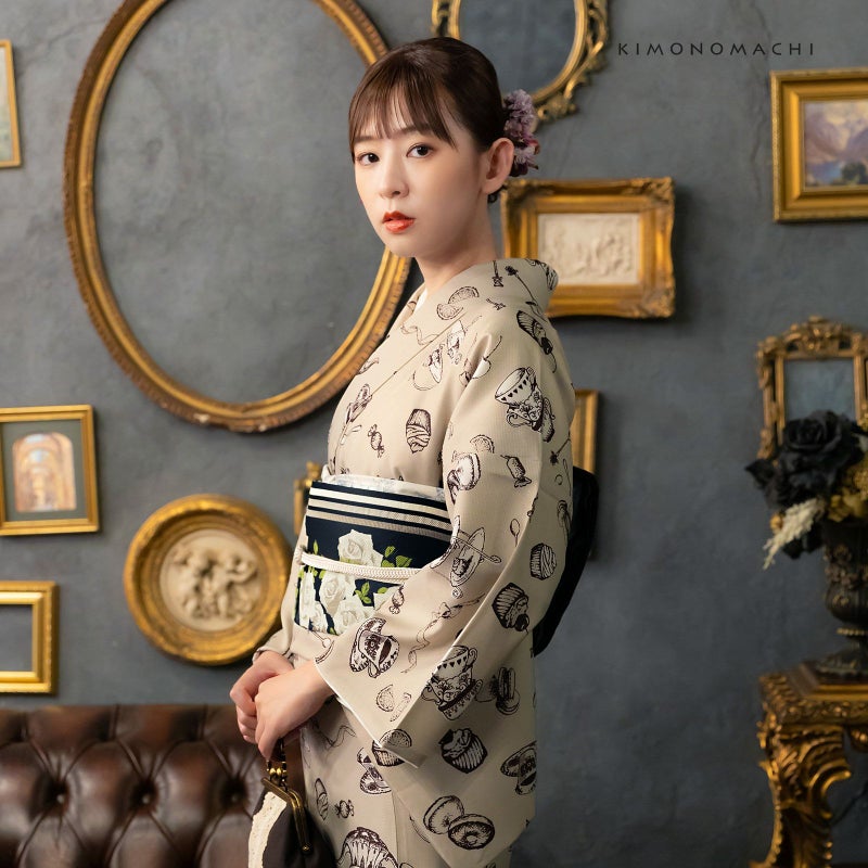 【色柄】細かな地模様のある生地。ややグレイッシュなベージュの地に、こげ茶色の線で表現された茶器やお菓子、フルーツなどアフタヌーンティーのモチーフを散らした模様。部分的に白く抜いた柄が際立って見えます。ペン画調のカップやケーキ、マカロン、レモンなど、ぜひお茶会に着ていきたくなるデザインです。裏地は白。