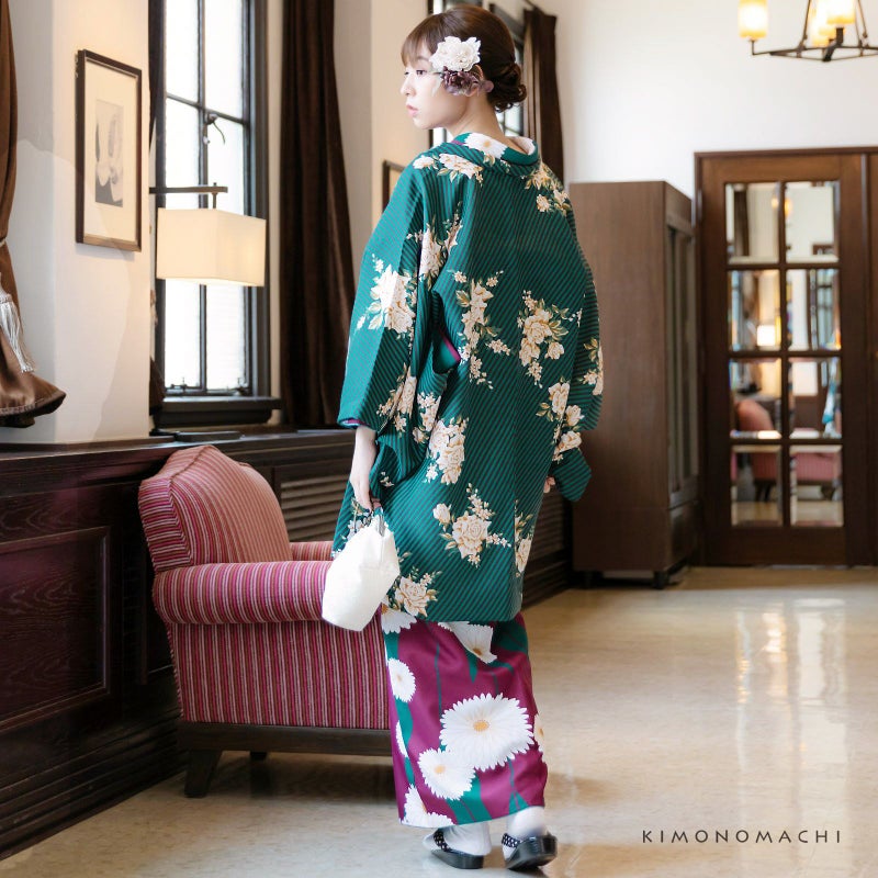 羽織:細かな地模様のある生地。青みの深緑に黒の斜めストライプの地、白にベージュ、キャメルのバラのブーケが飛び柄で表現されたスタイリッシュなデザイン。裏地は山吹茶。