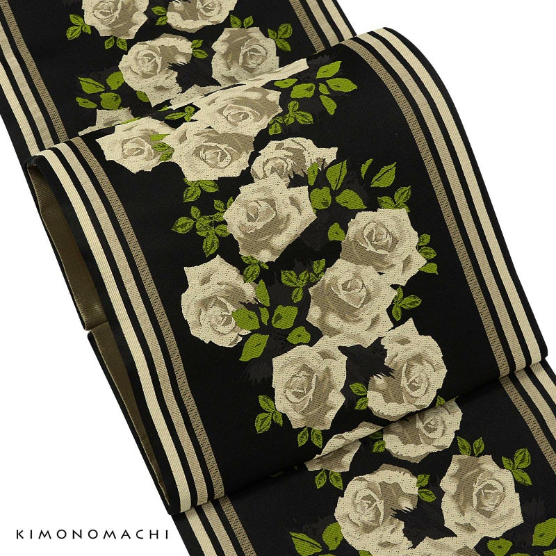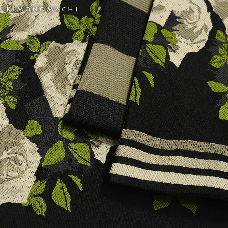 【色柄】黒地にサンドベージュや浅いカーキ、緑で表現されたバラの文様。浅い黒のシルエットが奥行きを添えています。両端に浅いベージュやカーキの三本縞。ヨーロッパのアンティークリボンのようなシックで上品なデザインです。裏は黒と浅いカーキの太いストライプ。