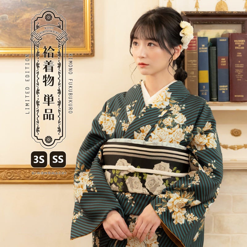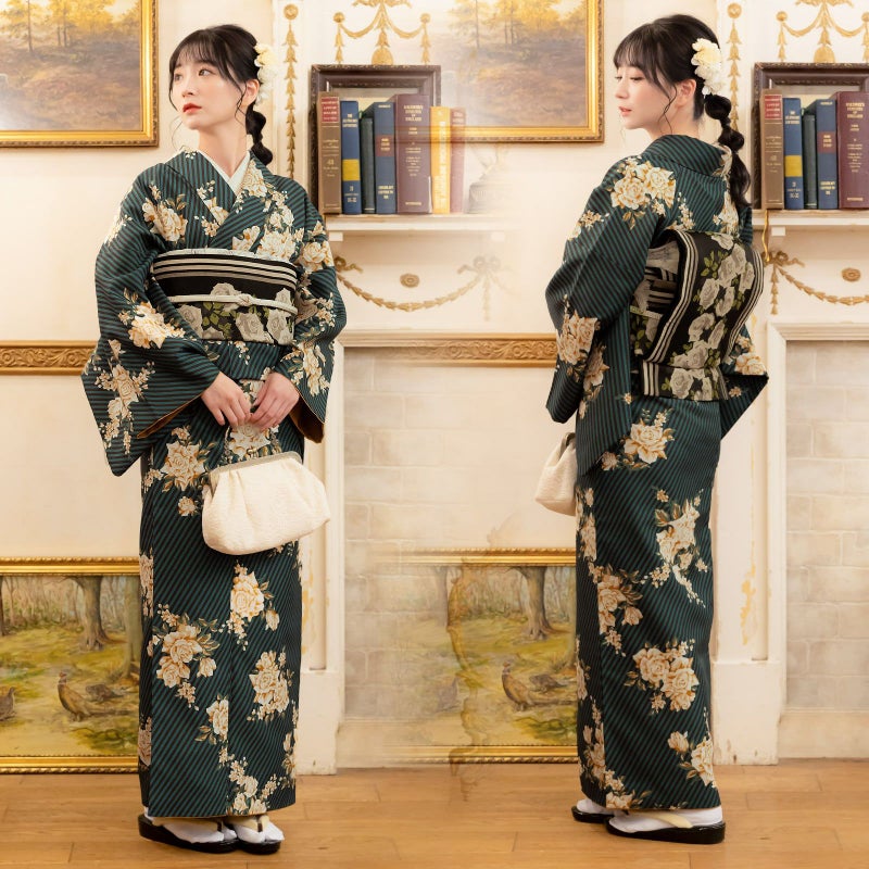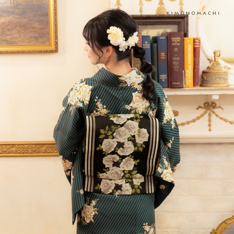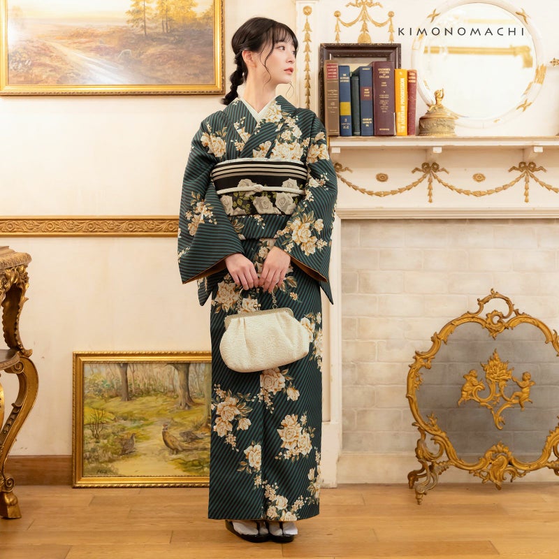 【色柄】細かな地模様のある生地。青みの深緑に黒の斜めストライプの地、白にベージュ、キャメルのバラのブーケが飛び柄で表現されたスタイリッシュなデザイン。裏地は山吹茶。