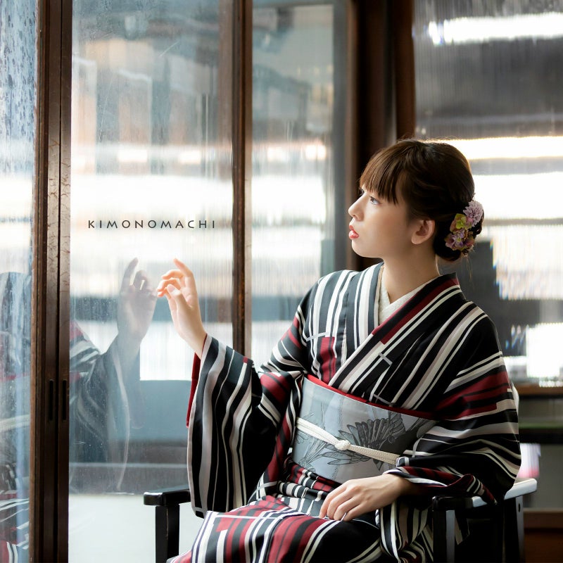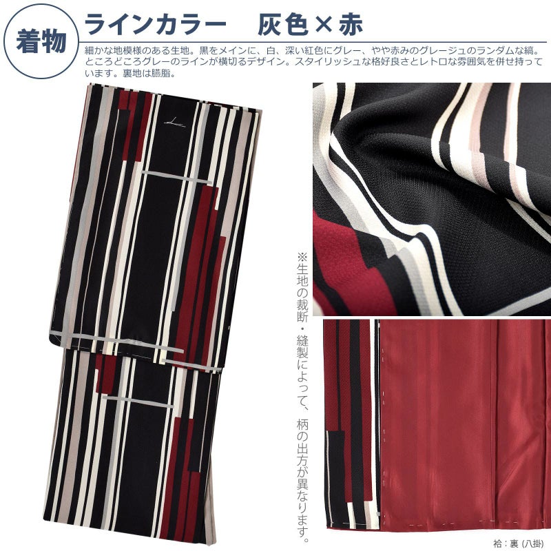 【色柄】細かな地模様のある生地。黒をメインに、白、深い紅色にグレー、やや赤みのグレージュのランダムな縞。ところどころグレーのラインが横切るデザイン。スタイリッシュな格好良さとレトロな雰囲気を併せ持っています。裏地は臙脂。