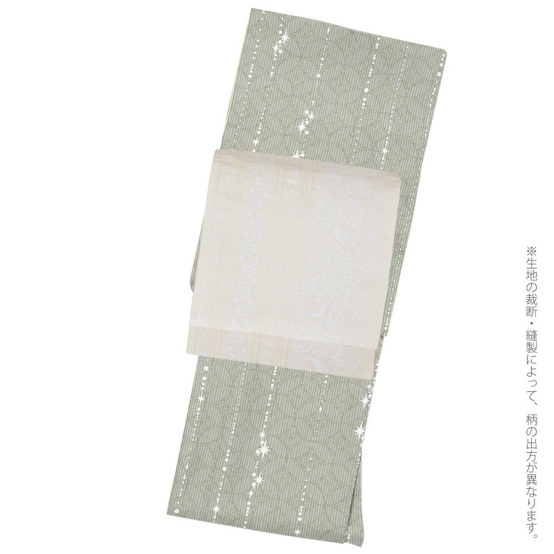着物:グレーの地にベージュグレーの花七宝文様と細かな縞が全体に表現されています。その上に縦に配置された白の大小のドットや星。零れ落ちた星くずのような控えめな輝きを感じさせるデザインです。裏はベージュ。