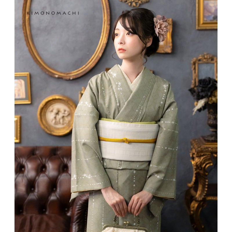 洗える着物 セット「袷着物:星くずに七宝利休鼠+京袋帯:献上鳥更紗」KIMONOMACHI オリジナル 着物と帯の2点セット サイズS/M/L/LL 2024-2025新作 コーディネート済み着物セット 小紋 レディース キモノ