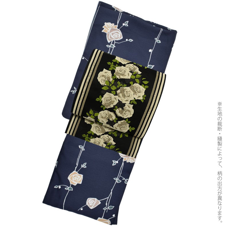 着物:細かな地模様のある生地。灰みの紺地に、ごく淡いグレーの輪郭線、ベージュやグレージュの花、深い青緑の葉のバラの花。やや直線的なデザインが現代的な中に懐かしさを感じさせます。裏地はグレー。
