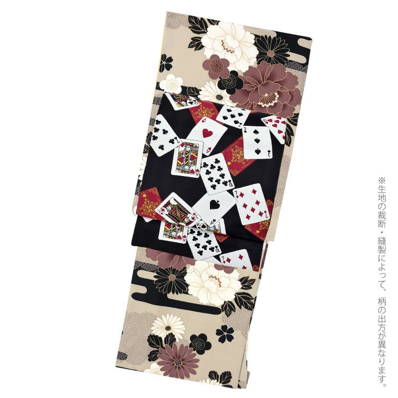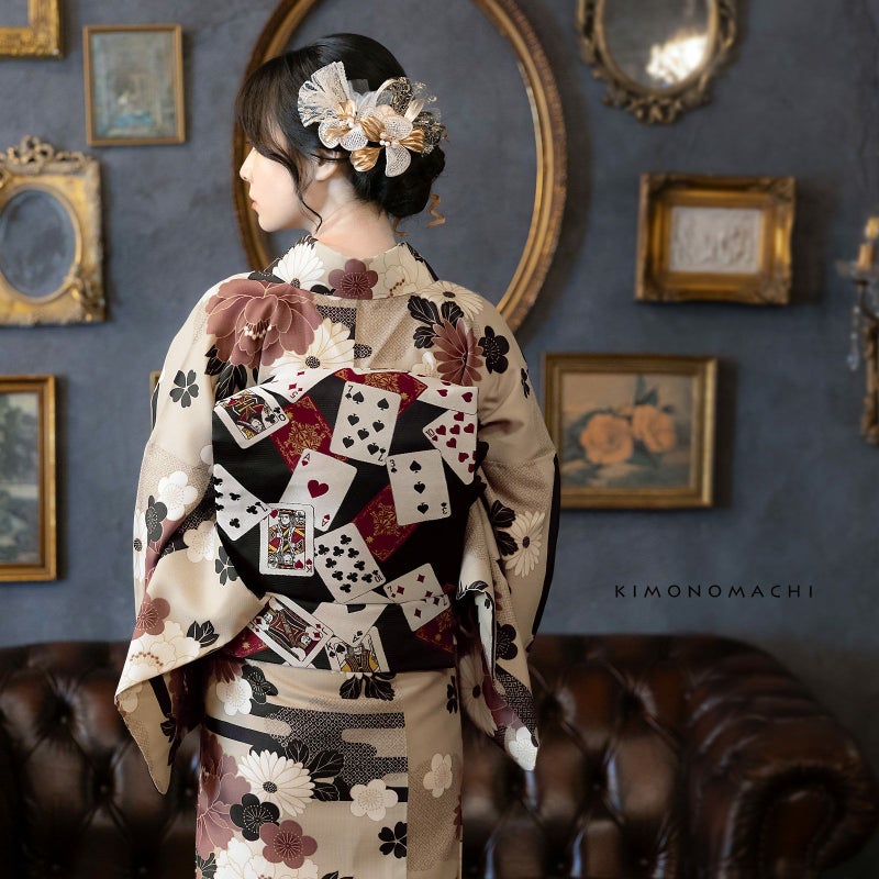 京袋帯:黒地にトランプのカードを散らしたデザイン。白地に各種のスートの数札、絵札の表情まで細やかに表現されています。臙脂色に金茶のアラベスク模様の裏面がアクセント。