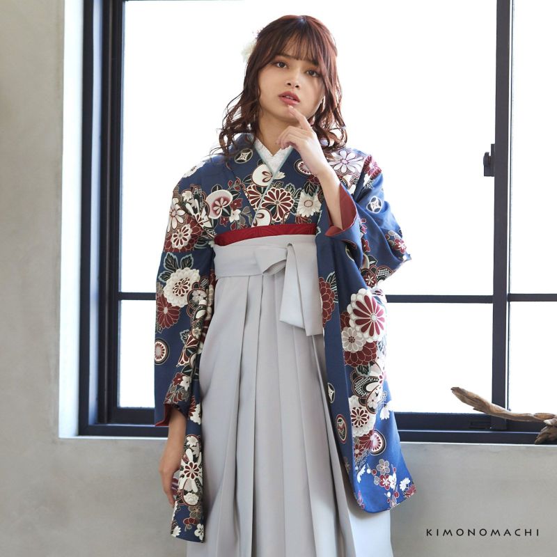 卒業式に 二尺袖袴セット 卒業式 袴 レディース 袴 セット 卒業式 女性 4点セット「二尺袖:花紋散らし 紺青+袴:アイスグレー 椿の刺繍+袴下帯:レッド 麻の葉+襦袢」卒業式 女性 レディース お仕立て上がり 袴セット 二尺袖着物セット 着物 二尺着物 袴【メール便不可】